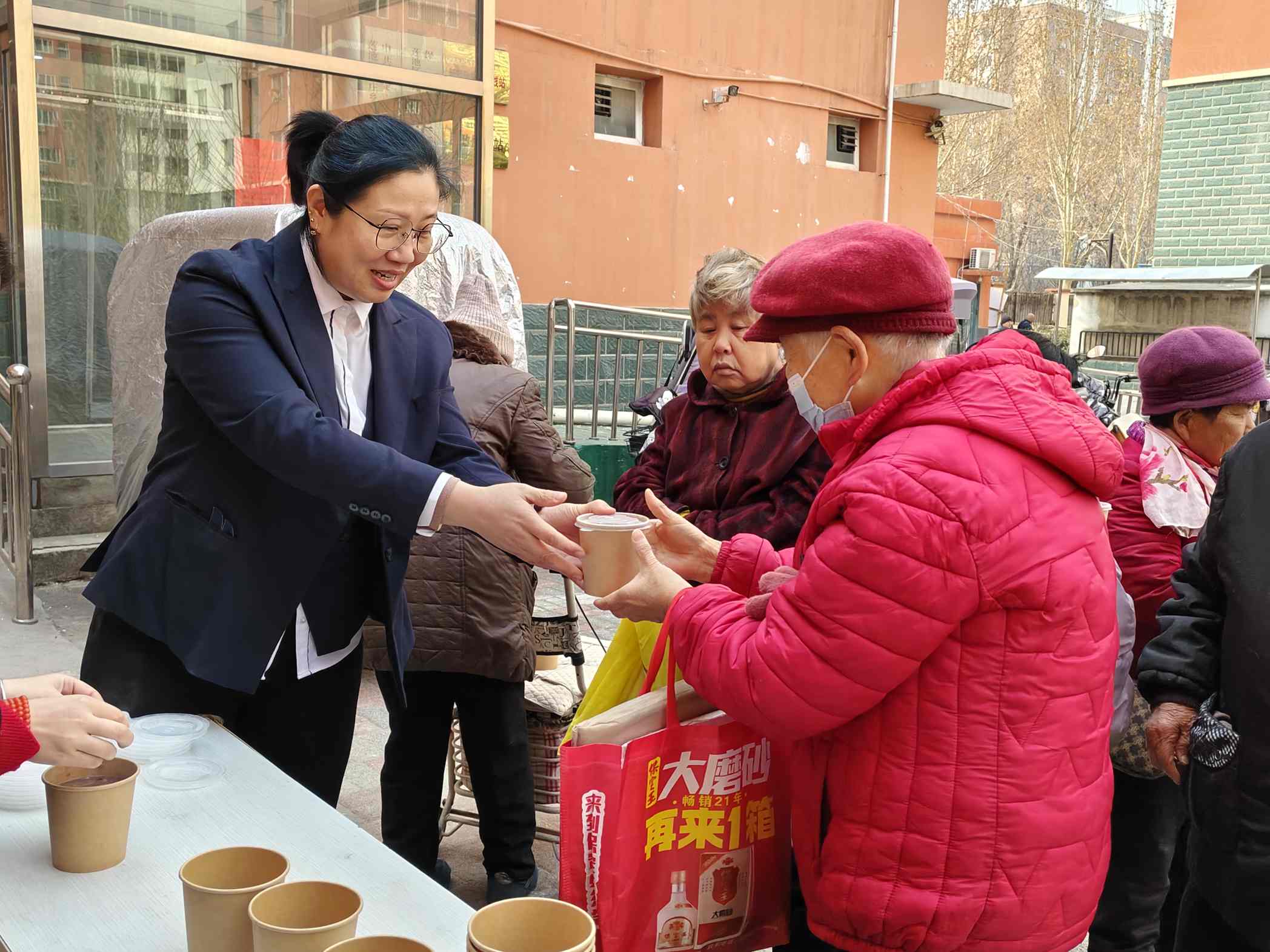在小区中心的小广场,物业设了一个固定发放点,居民们争相感受着寒日的温暖。物业的工作人员手脚麻利地盛粥、递碗,口中不住地叮嘱着,“小心烫,拿稳喽!”