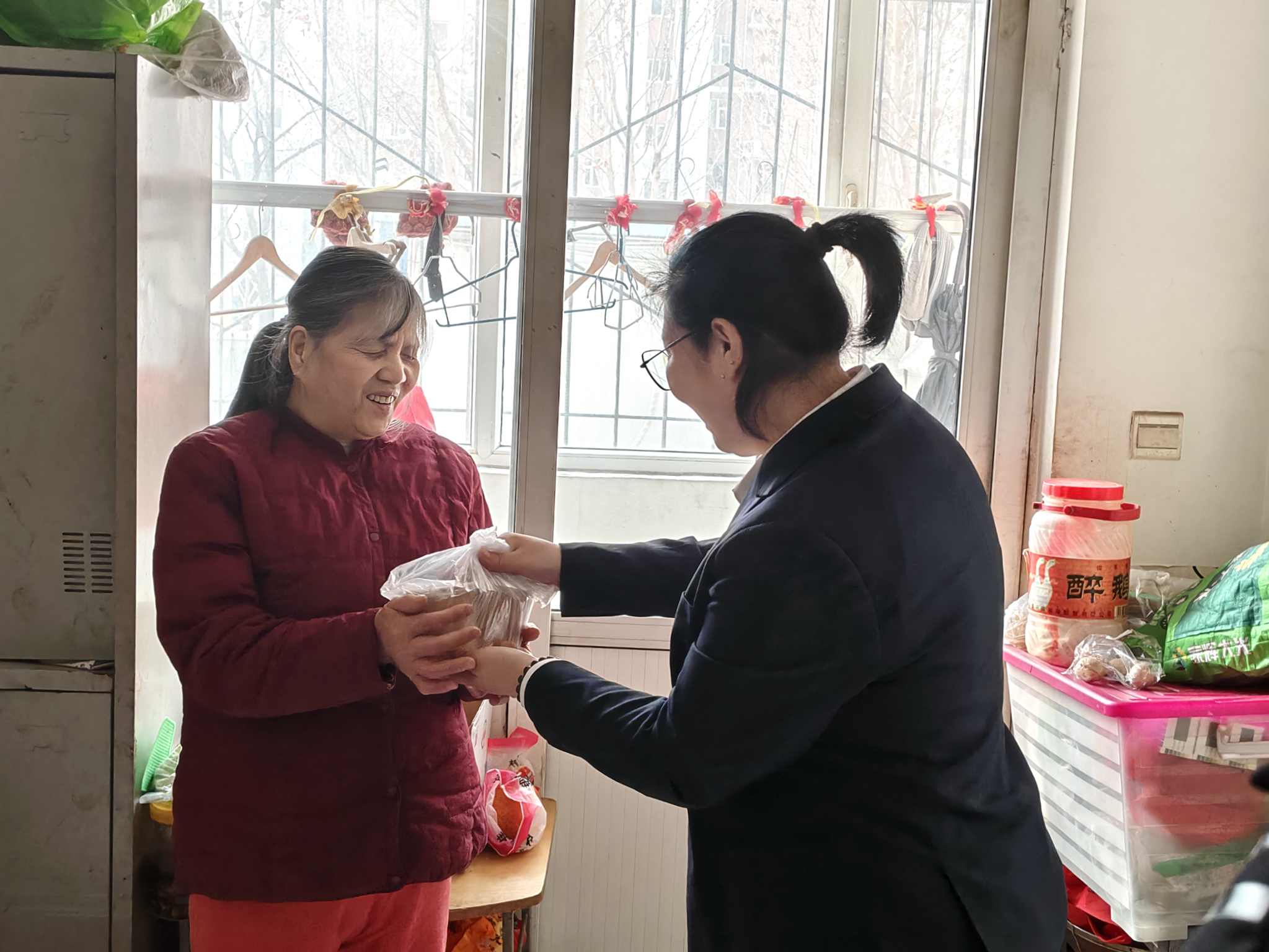 开门的是一位独居盲人李秀改,当她双手接过饭盒的一刻,腊八粥的热气很快渗进掌心,“我这眼睛不便,生活中点滴难处,他们都记在心上,默默帮我打点周全。这份情意更像是亲人之间沉甸甸的牵挂。有他们在,我心里就特别踏实,这日子也过得暖烘烘的。”