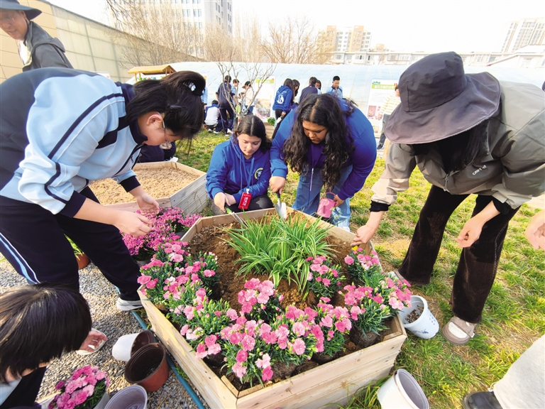 中外青少年携手开展园艺体验活动,在春日阳光下共同栽种花卉。