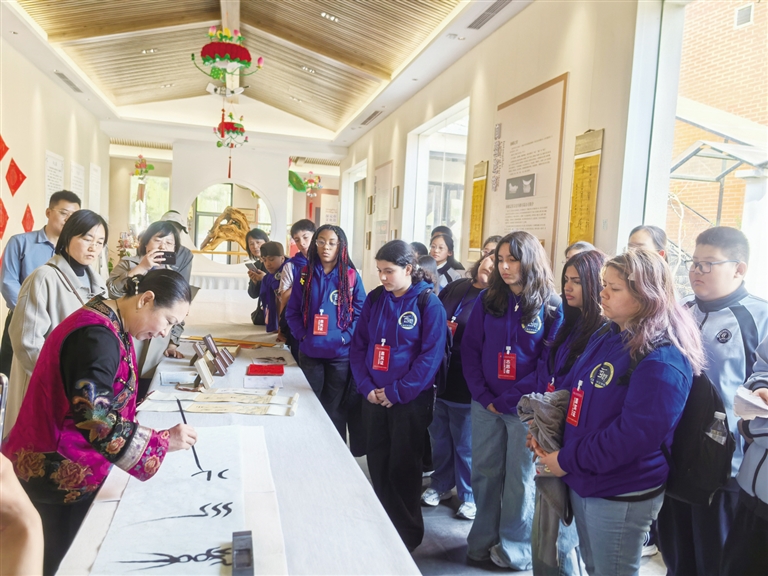 在南北非遗博物馆,“红楼梦”主题展为孩子们打开经典文学与非遗体验的大门。制香、茶事、古籍品读等展区吸引大家驻足互动。古琴悠扬,茶香袅袅,中美学子并肩而坐,共品中华茶文化与古琴艺术的悠远意境。中山篆书法体验环节,美国学子初次提笔,感受这一古文字的古朴韵味。在随后的学汉字环节,中国学子手把手指导美国伙伴执笔运笔,共同写下“共”字。一笔一画间,汉字之美跃然纸上,彼此的距离也在笔墨中悄然拉近。