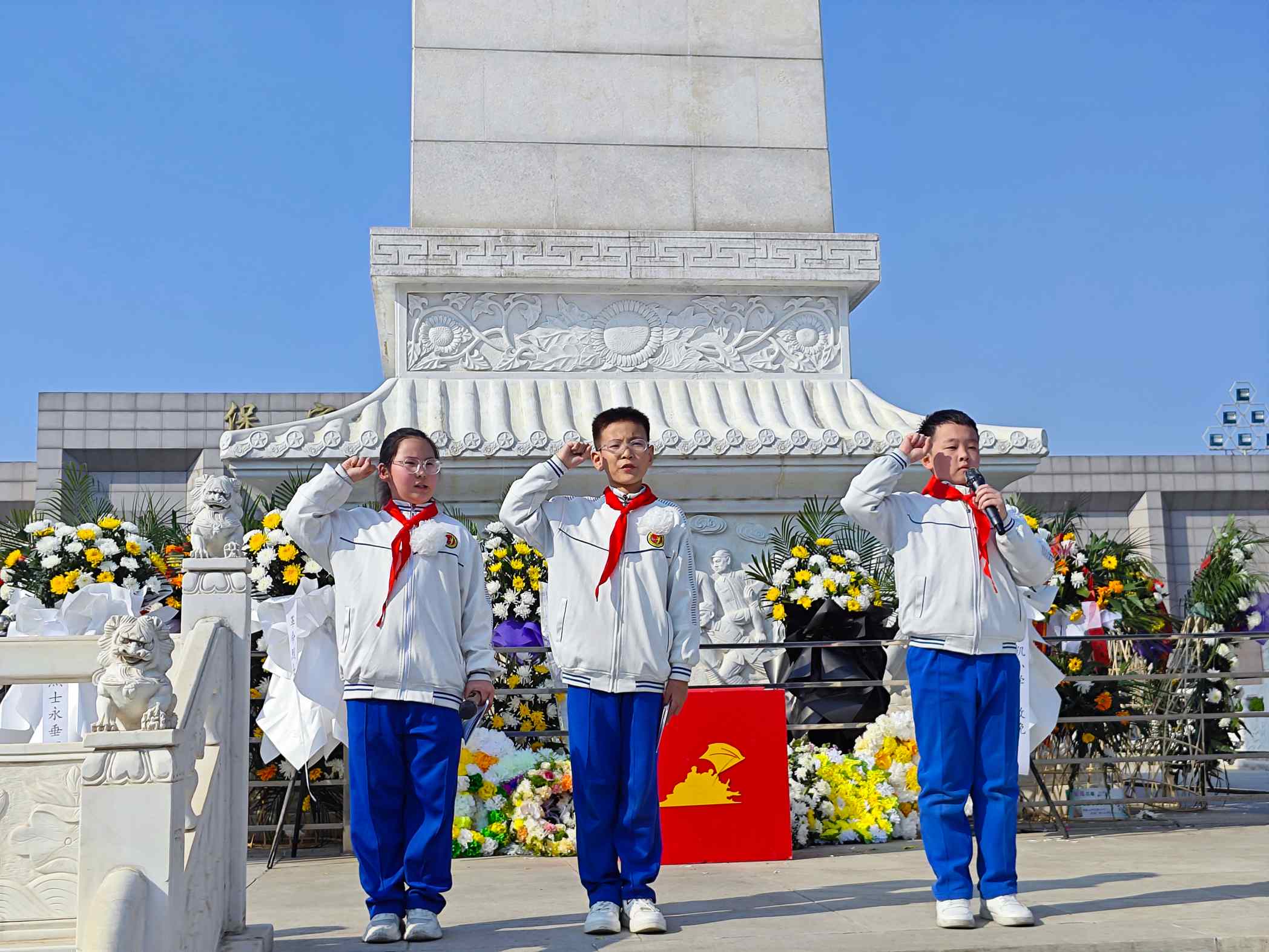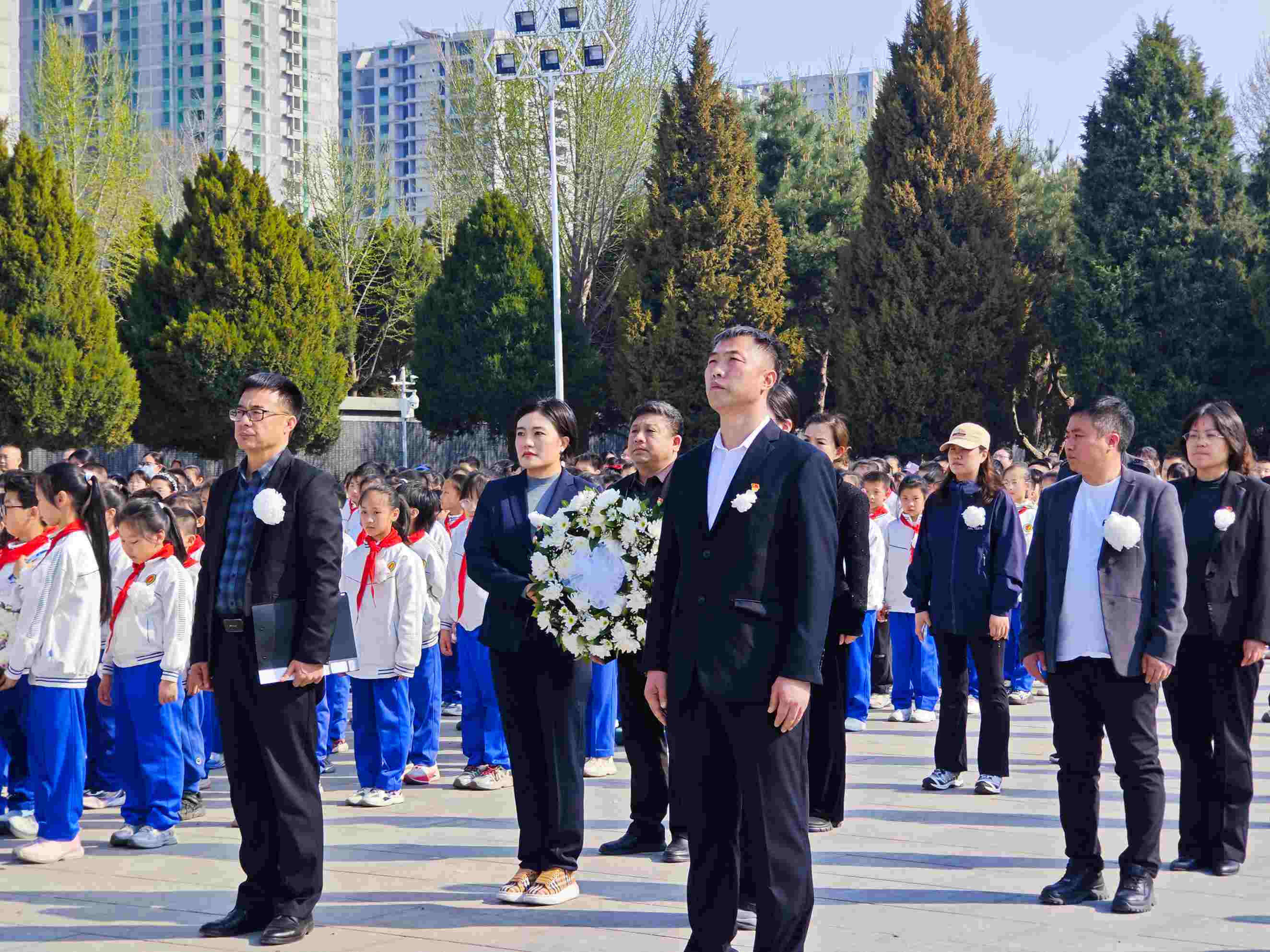 活动现场庄严肃穆,全体师生整齐列队,党员教师与少先队员代表向烈士敬献花环,全体肃立默哀,深切缅怀革命先烈的丰功伟绩。少先队员代表深情献词,诉说对英烈的崇敬与追思;校长寄语全体队员铭记历史、传承精神,争做新时代好少年。全体少先队员高举右拳庄严宣誓,誓言铿锵,彰显少年担当。