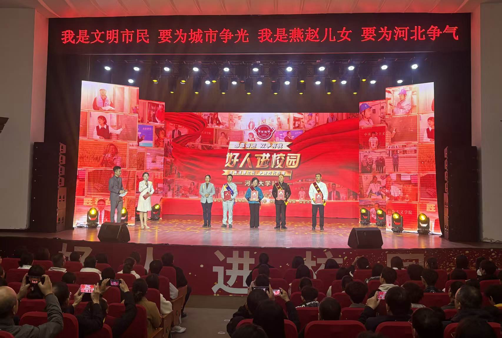 11月6日,由河北省文明办主办的“感恩奋进 双争有我——好人进校园”第四场活动在河北大学举行。活动以“身边人讲身边事”的方式,邀请“中国好人”刘洪安、杜振忠、邝秀兰和“大国工匠”张宏伟走进校园,与师生分享他们在平凡岗位上的不凡坚守。请听记者詹家静的报道:
