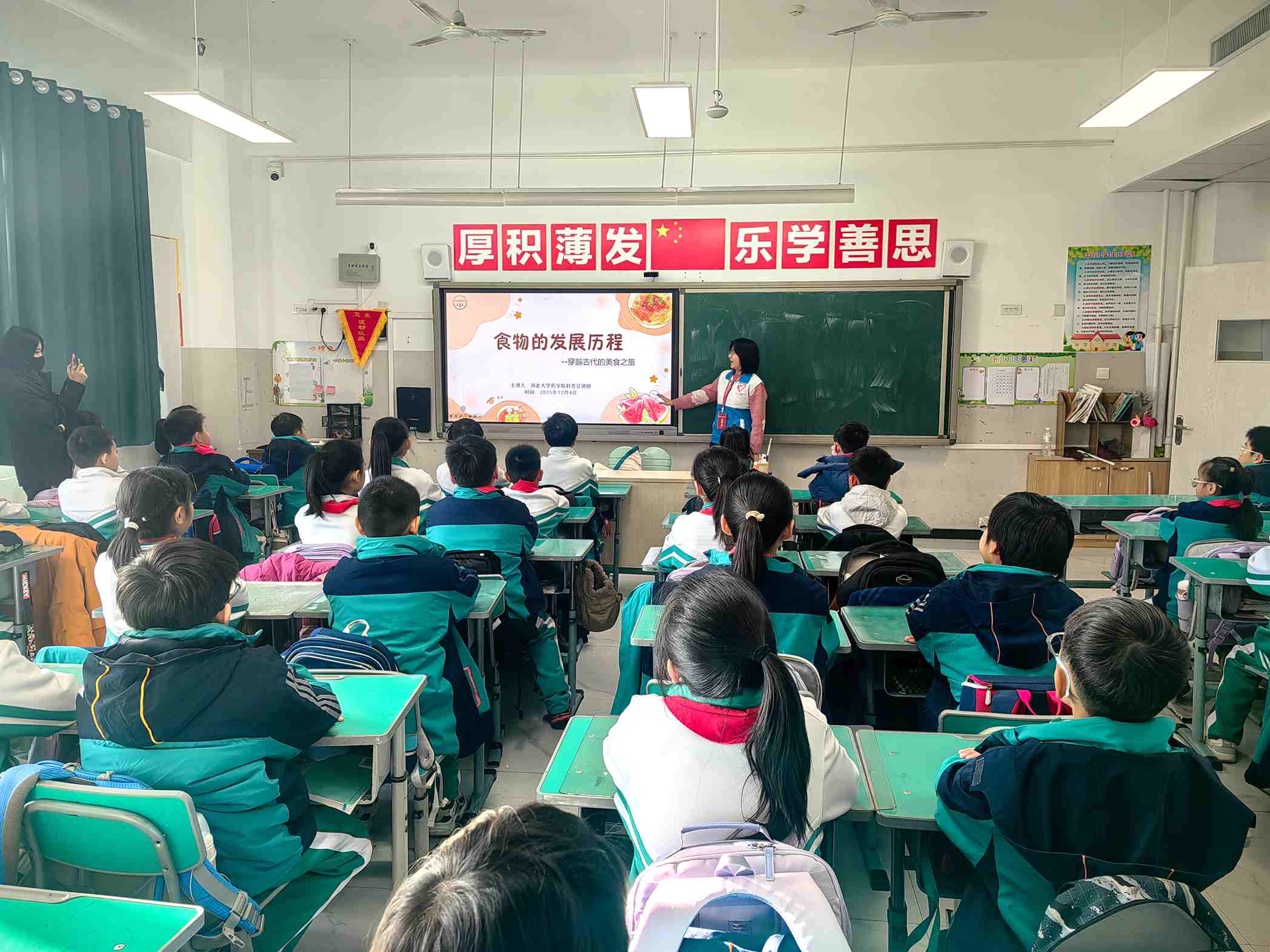 在河北小学四年级五班的教室里,来自河北大学药学院科普宣讲团的志愿者,正通过动漫和趣味问答,带领孩子们开启一场“穿越古代的美食之旅”,讲解“食物的发展历程”。课堂气氛热烈,孩子们目不转睛,争先恐后地举手互动。