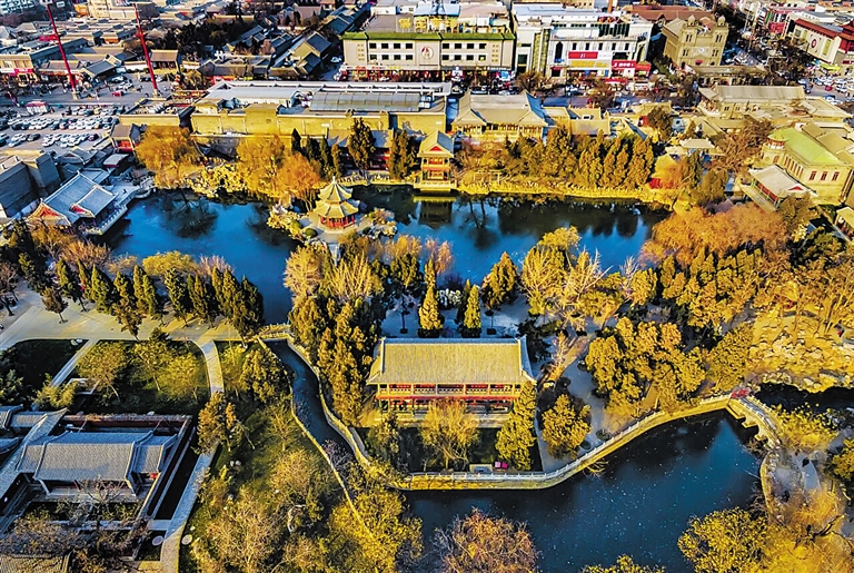 古莲花池内,正上演着色彩的交响。池畔的垂柳,半是青黄,在微风中摇曳着夏日的残梦。亭台楼阁间的银杏,已披上灿若朝阳的金甲,扇形叶片随风洒落,为青砖地面铺就一条流动的星河。静水残荷,依旧承载着秋日最后的斑斓,仿佛一位老者在冬日的门槛前,细细盘点着一整个季节的收藏。这斑斓的色彩是自然对古城温柔的道别。