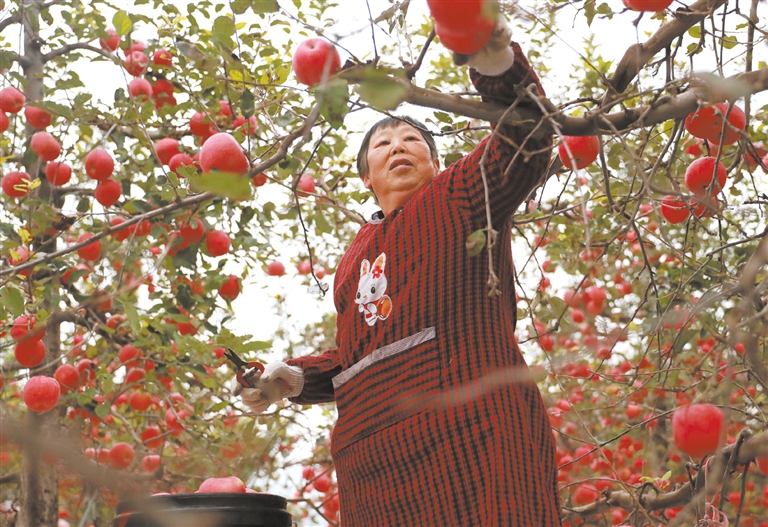 | 顺平县果农正在采摘富硒苹果。 赵端 摄 |