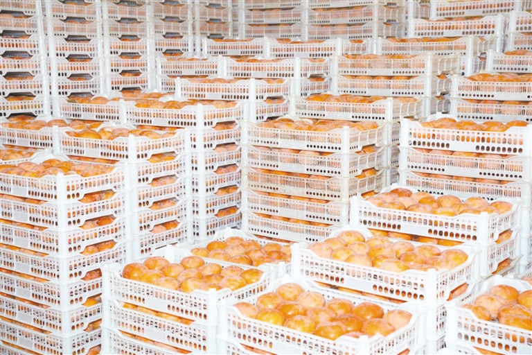 | 保定冰柿工厂冷库内的磨盘柿整齐摆放。 新畿辅-保定日报记者 班静怡 摄 |
